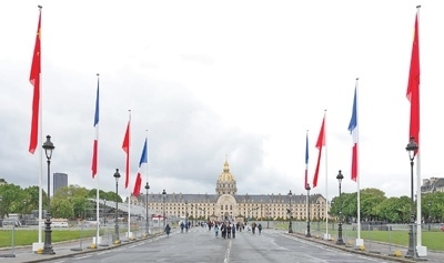 法國巴黎榮軍院前街道兩側(cè)懸掛中法兩國國旗。本報記者 王 遠(yuǎn)攝