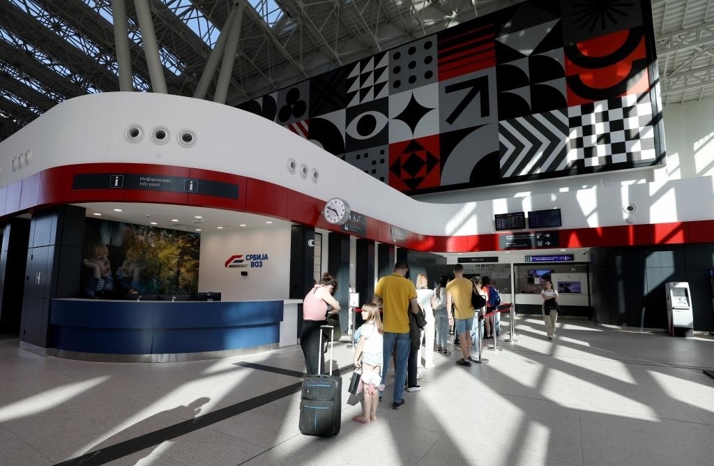 ?4月29日,在塞爾維亞貝爾格萊德中央火車站,人們?cè)谂抨?duì)購買車票。新華社記者李穎攝