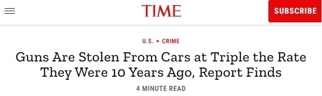 “為每個(gè)城鎮(zhèn)帶來(lái)槍支安全”組織的報(bào)告發(fā)現(xiàn),2022年美國(guó)被盜槍支總數(shù)接近11.2萬(wàn)支,其中超過(guò)一半是從汽車中盜取的——最常見(jiàn)的情況是停在車道或家門口的車。根據(jù)可獲得的最新數(shù)據(jù)顯示,2022年平均每9分鐘就有至少一把槍支從車內(nèi)被盜。但幾乎可以肯定的是,這是個(gè)被低估的數(shù)字,因?yàn)槁?lián)邦法律沒(méi)有要求人們報(bào)告被盜槍支,且美國(guó)只有三分之一的州法律要求報(bào)告。