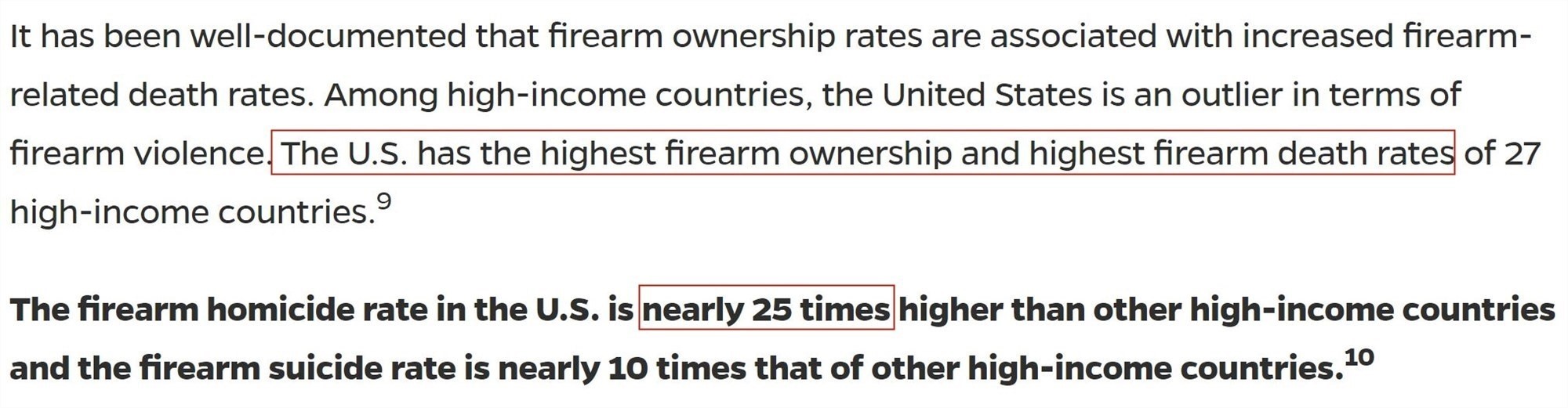 △約翰斯·霍普金斯大學槍支暴力解決方案中心官網(wǎng):數(shù)據(jù)表明,槍支擁有率與槍支相關的死亡率上升密切相關。在高收入國家中,美國的槍支擁有率和槍支引發(fā)的死亡率最高,是其他高收入國家的近25倍。