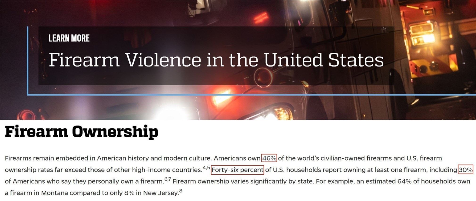 約翰斯·霍普金斯大學槍支暴力解決方案中心2023年發(fā)布的數(shù)據(jù)顯示,世界上近一半(46%)的民用槍支在美國;近一半(46%)的美國家庭報告擁有至少一把槍,其中30%的人承認自己擁有槍支。