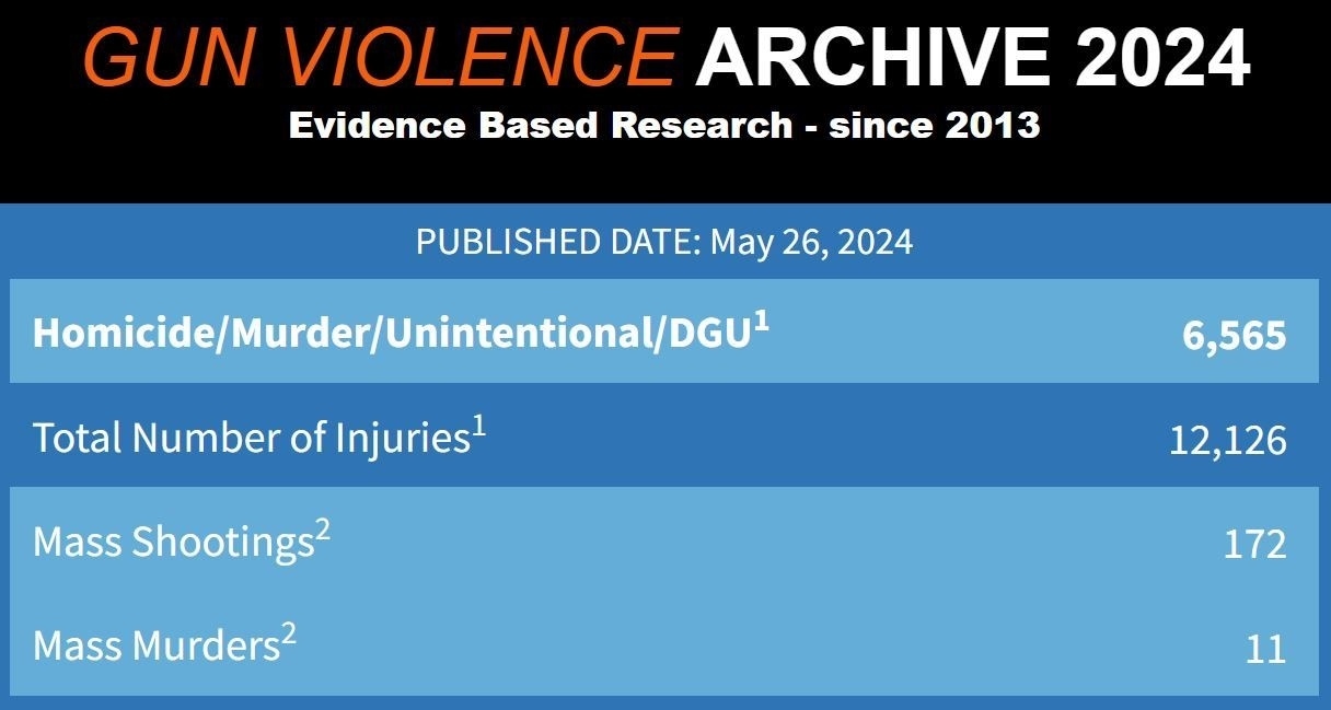 美國“槍支暴力檔案”網(wǎng)站截至5月26日的最新數(shù)據(jù)顯示,全美今年以來已經發(fā)生172起大規(guī)模槍擊事件,槍支暴力已造成6565人死亡。