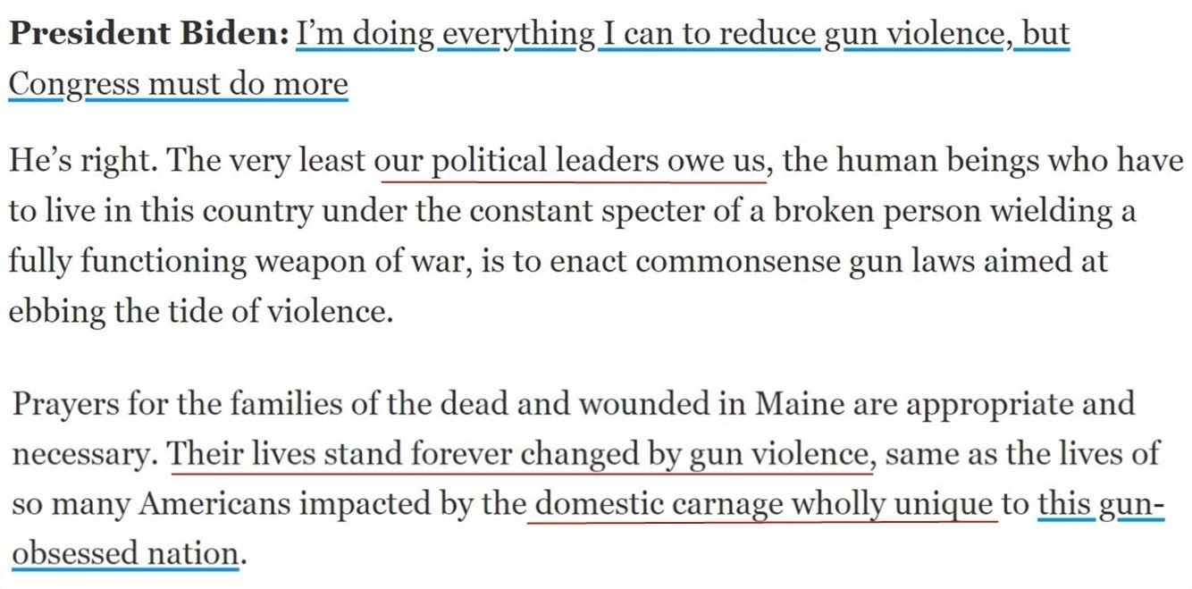 《今日美國報》曾評論說,美國至今沒有一部能夠遏制槍支暴力的有效控槍法案,“這是我們的政治領導人欠我們的”。