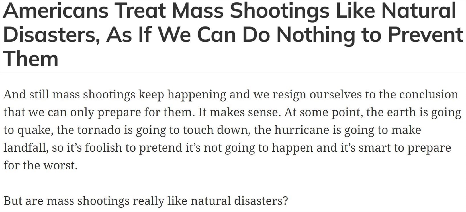 有美媒稱,對于一起又一起槍擊事件,如今的美國只是進行數(shù)字的統(tǒng)計,卻無力采取行動改變現(xiàn)狀,似乎在美國人眼里,槍支暴力已經成為像洪水、颶風、野火一樣的“天災”,而不是可以預防的人禍。