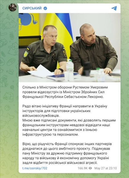 5月27日,烏克蘭武裝部隊(duì)總司令亞歷山大·瑟爾斯基(Oleksandr Syrskyi)在Telegram平臺(tái)上發(fā)文,稱法國有意向?yàn)蹩颂m派遣教官,培訓(xùn)烏軍人員,并表示已簽署相關(guān)文件,允許首批法國教官訪問烏軍培訓(xùn)中心。
