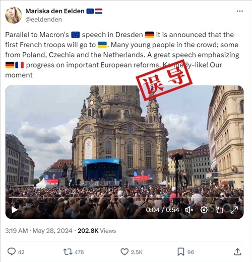 X平臺(tái)用戶@NinaHaase在28日凌晨2點(diǎn)03分發(fā)布的推文截圖,稱“現(xiàn)在,法國總統(tǒng)埃馬紐埃爾·馬克龍正在德累斯頓發(fā)表演講,他開場用了德語”,沒有提到法國軍隊(duì)。