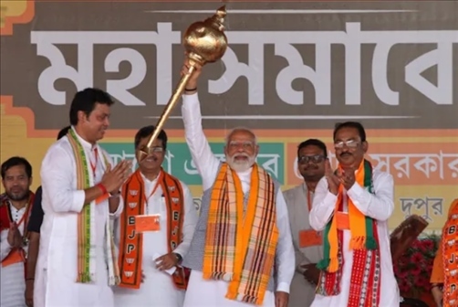 4月17日,印度特里普拉邦,莫迪在競選集會上擺pose 圖源:路透社