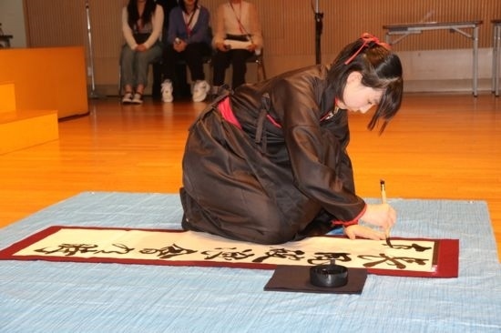 6月15日,在日本東京,選手在“漢語橋”世界中學(xué)生中文比賽日本賽區(qū)決賽中展示中文書法。記者 胡曉格 攝