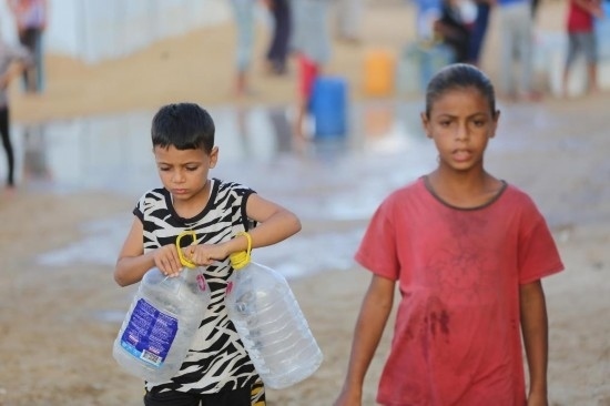 9月26日,在加沙地帶中部城市代爾拜拉赫,當?shù)孛癖娬谶\水。新華社發(fā)(馬爾萬·達烏德攝)