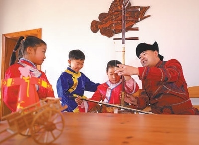 哈拉新村村民在教當(dāng)?shù)睾⒆友葑鄠鹘y(tǒng)樂器。齊齊哈爾大學(xué)孟加拉國(guó)籍留學(xué)生 衣睿實(shí)攝“在哈拉新村,我看到四弦琴造型的村口大門、魚叉狀的路燈,還有整整齊齊的‘介字房’……這里獨(dú)特的民族文化、濃郁的鄉(xiāng)土風(fēng)情,給我留下了深刻印象。當(dāng)?shù)丶缺A魝鹘y(tǒng)的達(dá)斡爾族人文特征,又開發(fā)文化體驗(yàn)館、民族特色美食等現(xiàn)代旅游資源,重視文化保護(hù)和傳承的做法值得借鑒?!?/p>