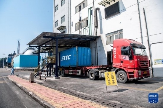 10月17日,在中國石化集團重慶川維化工有限公司,工作人員在將以乙炔為原料生產的化工產品進行打包裝車。