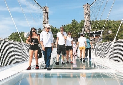 | 外國(guó)游客在湖南張家界大峽谷景區(qū)玻璃橋上參觀游覽。吳勇兵攝(人民圖片) |