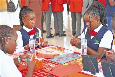 今年2月,在肯尼亞內(nèi)羅畢大學(xué)孔子學(xué)院舉辦的2024“歡樂春節(jié)之龍騰鼓躍鬧新春”活動上,當(dāng)?shù)貙W(xué)生體驗(yàn)中國剪紙。本報記者 黃煒鑫攝