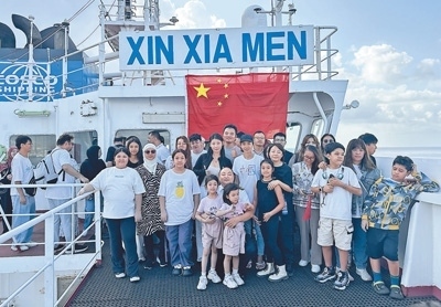 撤離人員在“新廈門號(hào)”輪上合影。外交部供圖