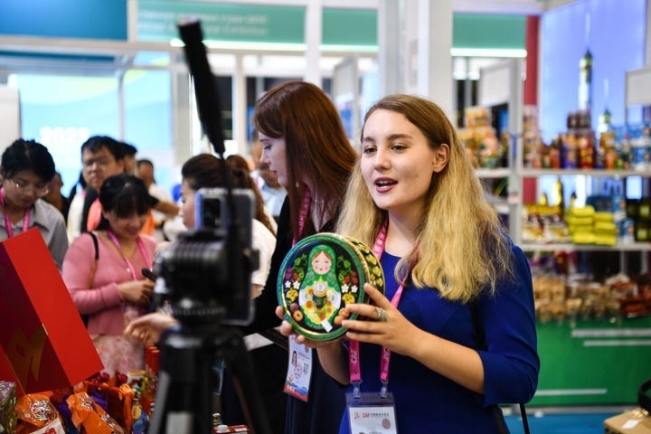 2023年9月19日,來自俄羅斯的參展商在中國(guó)陜西楊凌農(nóng)高會(huì)展臺(tái)進(jìn)行直播。新華社記者 張博文 攝