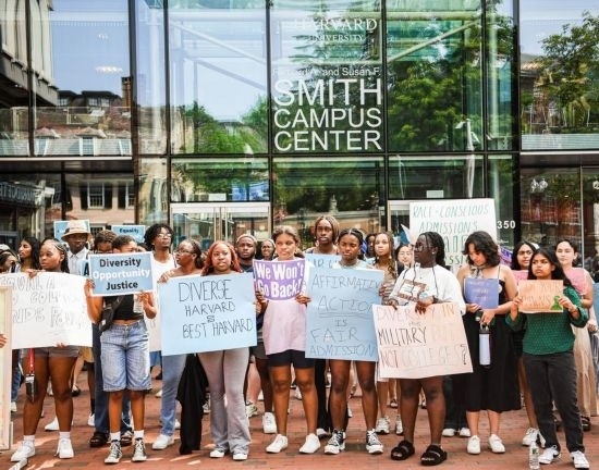 2023年7月1日,在美國馬薩諸塞州劍橋,人們手持標語在哈佛大學校園舉行游行,抗議美國聯(lián)邦最高法院做出的招生政策判決。新華社發(fā)(朱子于攝)