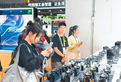 觀眾在進(jìn)博會尼康相機(jī)展臺參觀。本報記者 高 喬攝