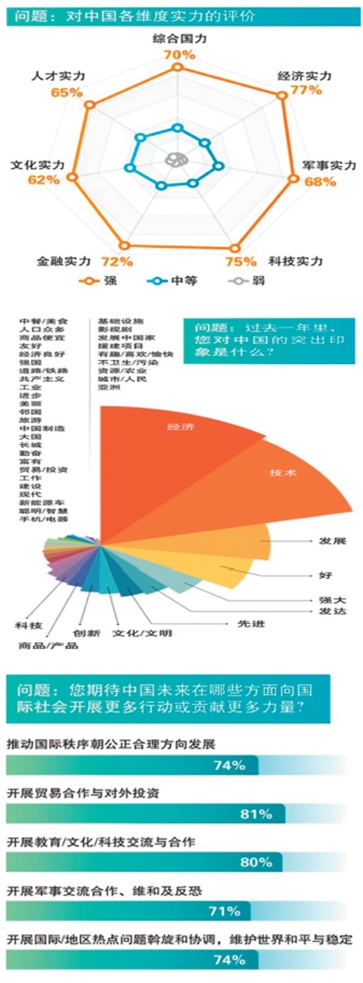 調(diào)查問卷讓被訪者自主描繪其過去一年里對中國的突出印象。報告顯示,各國民眾使用率最高的關(guān)鍵詞包括“經(jīng)濟”“技術(shù)/科技”“發(fā)展/發(fā)達(dá)”“好”“強大/強國”“先進(jìn)/創(chuàng)新”“文化/文明”“商品/產(chǎn)品”“人口眾多”“中餐/美食”等。在發(fā)達(dá)國家、歐洲國家、中東國家和東盟國家,“經(jīng)濟”被提及的頻次居首;在發(fā)展中國家、非洲國家、金磚國家,“技術(shù)”被提及的頻次最高。