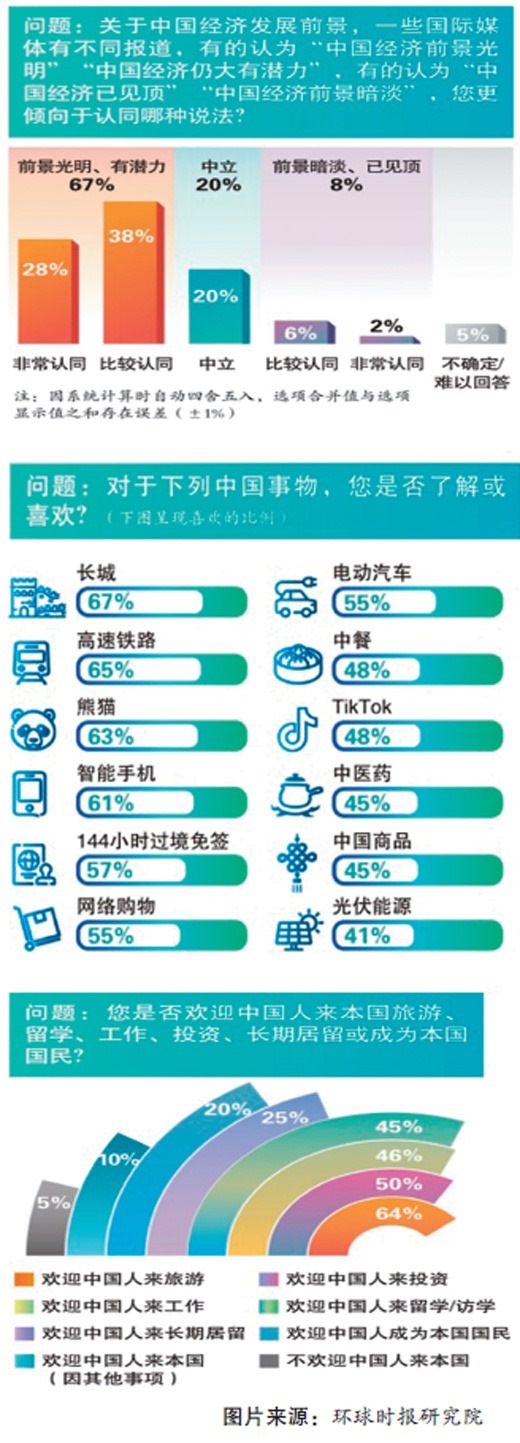 本次調(diào)查還列舉了10余項有代表性的中國事物,并逐一向國外民眾詢問喜愛與否。其中,長城(67%)、高鐵(65%)、熊貓(63%)、智能手機(61%)的獲喜愛比例超過六成,過境免簽(57%)、電動汽車(55%)和網(wǎng)絡(luò)購物(55%)的獲喜愛比例超過半數(shù),中餐(48%)和TikTok(48%)的獲喜愛比例接近半數(shù)。