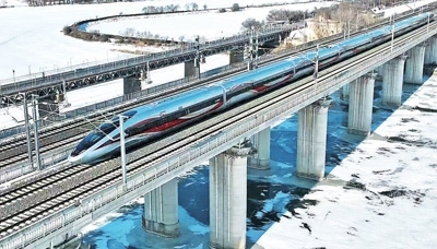 新型復(fù)興號(hào)高寒智能動(dòng)車組行駛在哈齊高鐵松花江特大橋上。