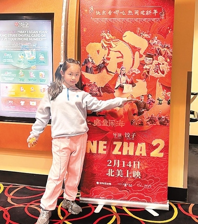 圖為唐夢竹的女兒在美國洛杉磯一家影院的《哪吒之魔童鬧?!沸麄骱?bào)前留影。