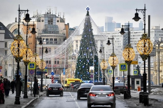 2023年12月22日,在俄羅斯首都莫斯科,車輛從新年樅樹(shù)附近駛過(guò)。新華社發(fā)(亞歷山大攝)