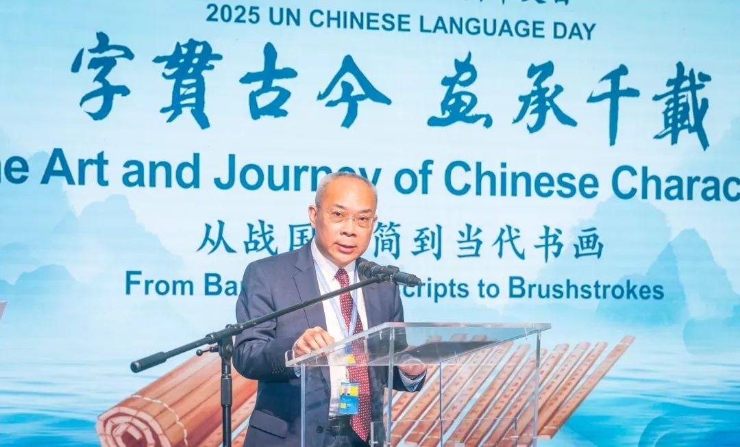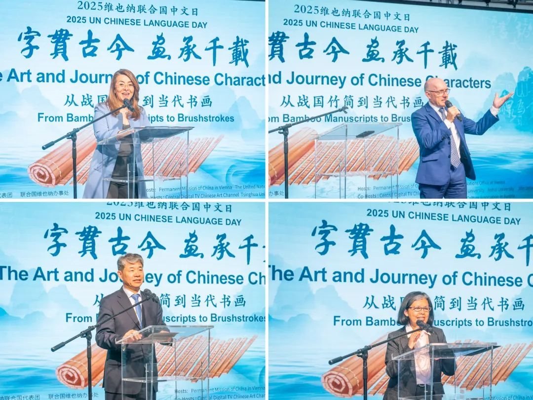 此次中文日活動(dòng)以“字貫古今 畫承千載——從戰(zhàn)國(guó)竹簡(jiǎn)到當(dāng)代書畫”為主題,由中國(guó)常駐維也納代表團(tuán)、聯(lián)合國(guó)維也納辦事處主辦,中央數(shù)字電視書畫頻道、清華大學(xué)、安徽大學(xué)、吉林大學(xué)協(xié)辦,共同為維也納聯(lián)合國(guó)總部獻(xiàn)上了一場(chǎng)中國(guó)文化盛宴。清華大學(xué)副校長(zhǎng)彭剛、中央數(shù)字電視書畫頻道董事局主席王平在開(kāi)幕式致辭,探討了文字、文化、文明三者之間的緊密關(guān)系和文明交流互鑒的重要意義。