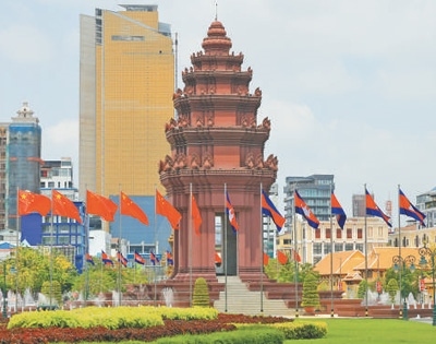 4月16日,在柬埔寨首都金邊市中心的獨立紀念碑前,中柬兩國國旗迎風(fēng)飄揚。