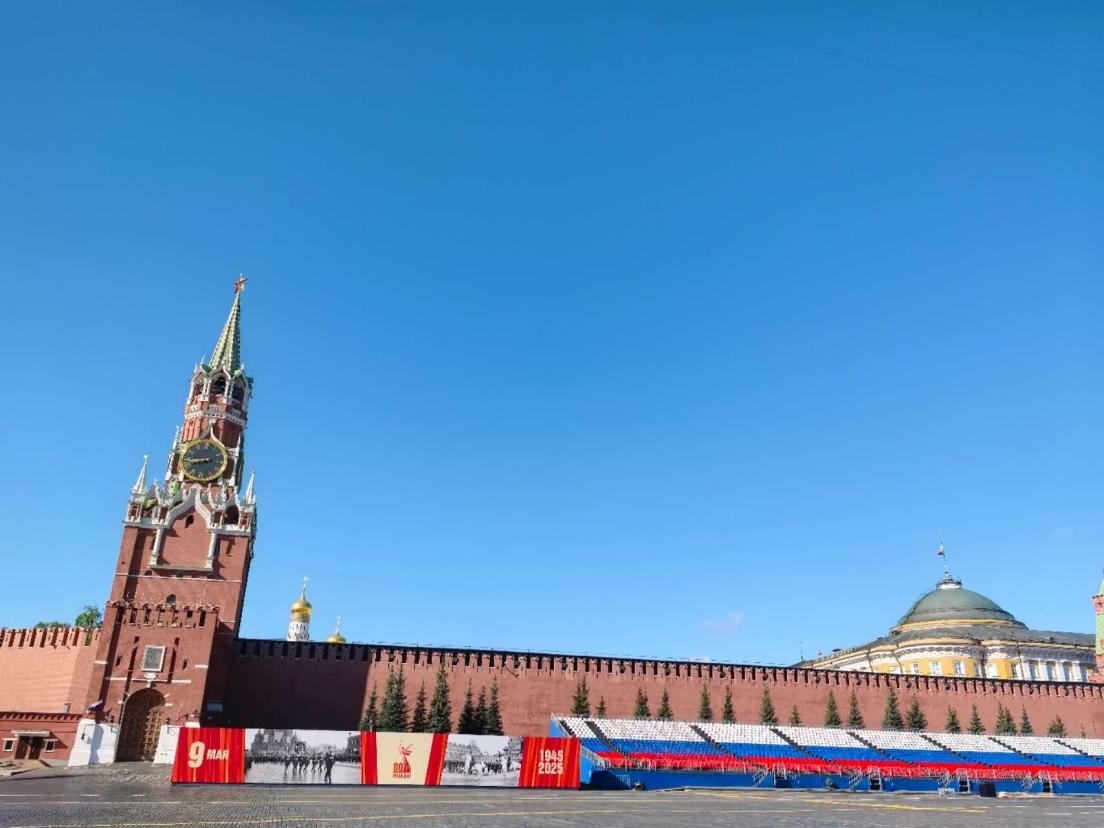 當(dāng)?shù)貢r(shí)間5月6日,紅場(chǎng)上的觀禮臺(tái)已準(zhǔn)備就緒。 鄺西曦 攝