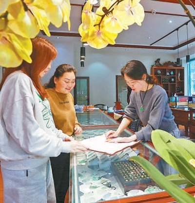 生在緬甸的余鴻仙便是其中之一?,F(xiàn)在向客人介紹翡翠時,她的中文流利得已經(jīng)聽不出分毫異國腔調(diào)。但在2008年剛到中國時,余鴻仙還只能用手比劃來交流。為了更快地適應中國生活,余鴻仙每晚跟著新聞逐字學習中文,花了五六年時間才日益熟練。
