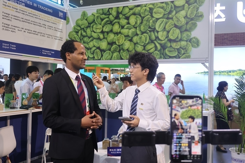 2025年6月14日,在第四屆中國-非洲經(jīng)貿博覽會上,埃塞俄比亞駐華公使內比尤·穆罕穆德參加現(xiàn)場直播帶貨。新華社記者 周昊瑾 攝