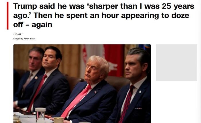 美國有線電視新聞網(wǎng)(CNN)注意到,當美國商務(wù)部長盧特尼克談及貿(mào)易戰(zhàn)時,特朗普“似乎難以睜開眼睛”。在美國教育部長麥克馬洪和美國衛(wèi)生與公眾服務(wù)部長小羅伯特·肯尼迪發(fā)言時,特朗普“似乎僵住了,閉著眼睛,每次持續(xù)10到15秒,然后才轉(zhuǎn)動眼球或點頭”。