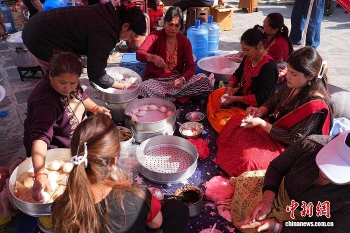 12月4日,尼泊爾加德滿都,婦女在攤位后圍坐,一同制作尤麻瑞。 中新社記者 崔楠 攝