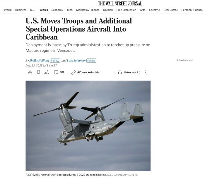 中新網(wǎng)12月24日電 據(jù)美國《華爾街日報》報道,本周美國已向加勒比地區(qū)調(diào)遣了大批特種作戰(zhàn)飛機(jī)、美軍人員及裝備,為華盛頓在委內(nèi)瑞拉采取軍事行動提供了更多選擇。