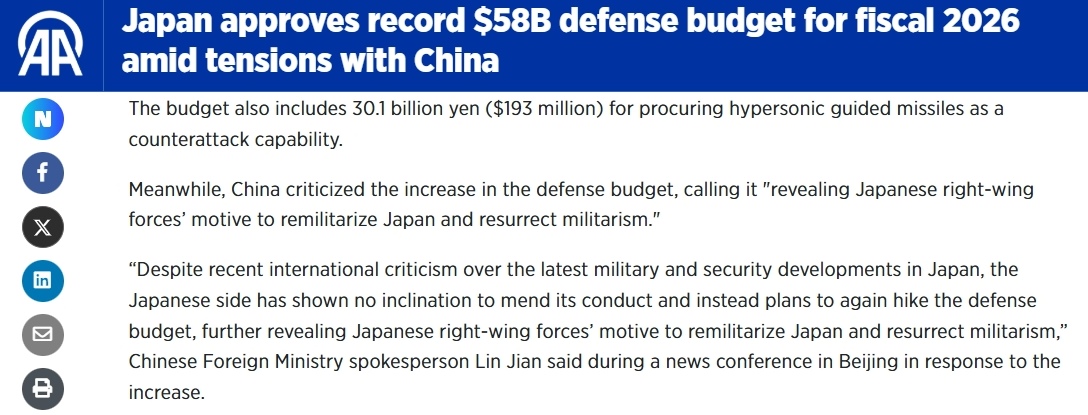 土耳其安納多盧通訊社26日的報(bào)道,列舉了日本創(chuàng)紀(jì)錄防衛(wèi)預(yù)算中涉及的方面,例如無人機(jī)、高超音速導(dǎo)彈和航空宇宙自衛(wèi)隊(duì)等。同時(shí),報(bào)道引述中方的批評稱,“近期國際社會對日本的軍事安全動(dòng)向,批評聲音不斷,日方不但沒有反省收斂,反而計(jì)劃再次大幅增加防衛(wèi)預(yù)算,更加暴露出日本右翼勢力推動(dòng)日本‘再軍事化’、企圖讓軍國主義死灰復(fù)燃的險(xiǎn)惡用心。”