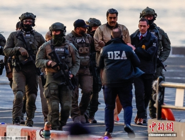 當?shù)貢r間1月5日,委內(nèi)瑞拉總統(tǒng)馬杜羅抵達美國紐約聯(lián)邦法庭,將在這里首次出庭受審。圖為馬杜羅在前往法院途中。