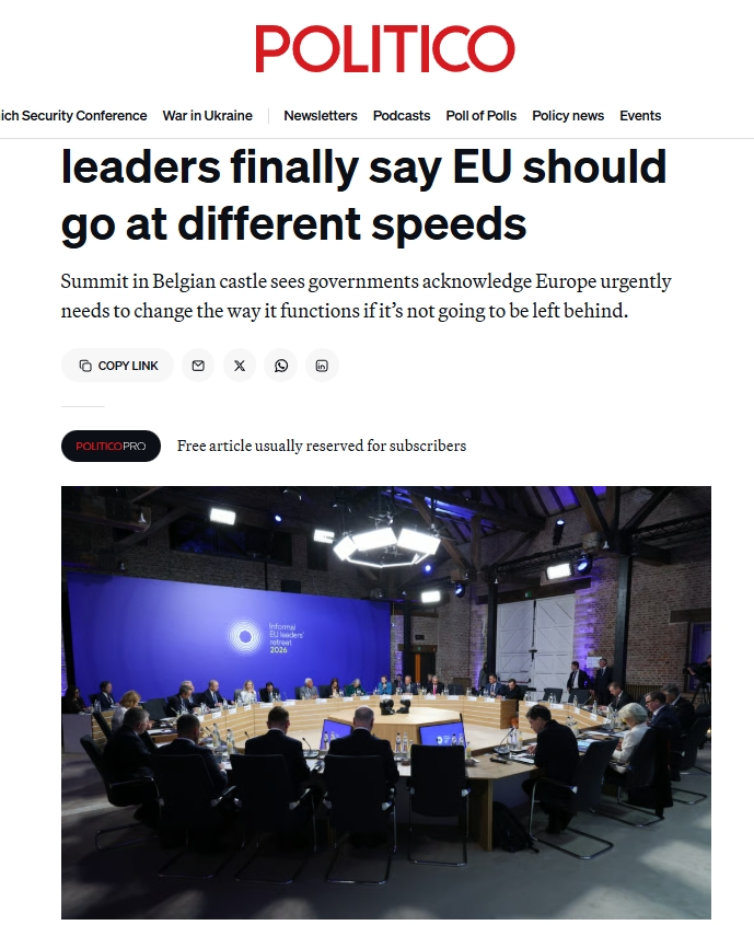 《政治報(bào)》網(wǎng)站歐洲版的報(bào)道評(píng)論稱,歐盟一直以其成員國(guó)團(tuán)結(jié)一致向前邁進(jìn)而自豪,那個(gè)時(shí)代已經(jīng)結(jié)束了。2月12日在比利時(shí)舉行的會(huì)議上,法國(guó)、德國(guó)、意大利等多國(guó)領(lǐng)導(dǎo)人支持,最早將于下個(gè)月的歐洲理事會(huì)上形成一項(xiàng)計(jì)劃,以簽署組成更小團(tuán)體的倡議。各國(guó)政府表示,由于歐洲的許多想法陷入優(yōu)柔寡斷和不和諧之中,歐洲的競(jìng)爭(zhēng)優(yōu)勢(shì)正在逐漸消失,因此他們感到一種緊迫感。