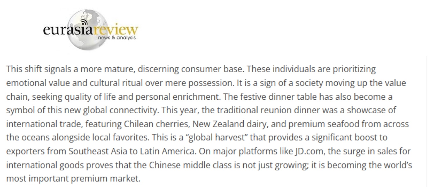 文章稱,這種轉(zhuǎn)變標(biāo)志著中國消費(fèi)者變得更加成熟、更具品位。他們更注重情緒價值和文化儀式感,而不僅僅是物質(zhì)追求。這象征著社會正朝著價值鏈上游邁進(jìn),追求生活品質(zhì)和個人提升。節(jié)日的餐桌也已成為這種新型全球互聯(lián)的象征。今年,傳統(tǒng)年夜飯成為國際貿(mào)易的展示窗口:既有智利車?yán)遄?、新西蘭乳制品和來自大洋彼岸的優(yōu)質(zhì)海鮮,也有本地美食。這是一場“全球豐收”,為從東南亞到拉丁美洲的商品出口提供了強(qiáng)大動力。在跨境電商平臺上,國際商品的銷售激增證明了中國正在成為全球最重要的高端消費(fèi)市場。