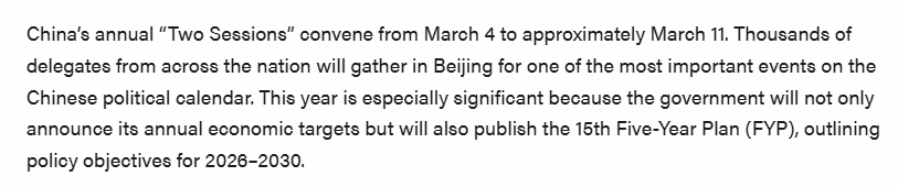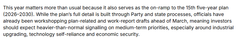 文章說,今年的兩會(huì)尤為關(guān)鍵,將為第十五個(gè)五年規(guī)劃(2026-2030年)奠定基礎(chǔ)。投資者應(yīng)關(guān)注比往年更明確的政策信號,特別是在產(chǎn)業(yè)升級、科技自主和經(jīng)濟(jì)安全等領(lǐng)域。