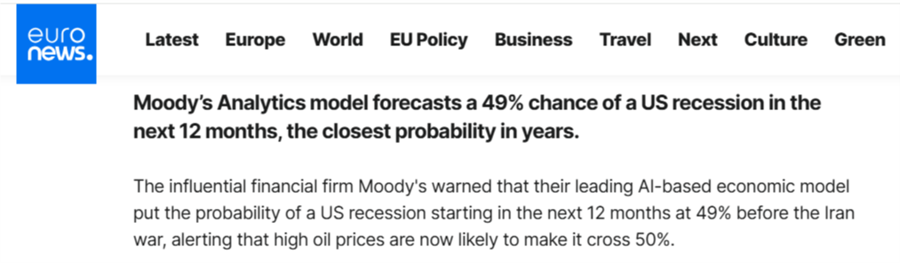 美政府接連出手的背后是疲軟的經(jīng)濟與通脹的預期無法承受高油價。而放任針對能源基礎(chǔ)設(shè)施的襲擊將進一步威脅全球能源供應,推高油價。目前美國汽油價格已飆升至自2023年以來的最高水平,而據(jù)歐洲新聞臺3月18日報道,穆迪分析(Moody's Analytics)模型預測,未來12個月內(nèi)美國經(jīng)濟陷入衰退的概率為49%,這是多年來最接近臨界點的一次。該模型還提醒稱,當前高企的油價很可能使這一概率突破50%。