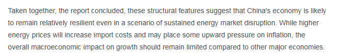 報(bào)告總結(jié)稱,即便能源市場持續(xù)動(dòng)蕩,中國受沖擊程度也將明顯輕于其他主要經(jīng)濟(jì)體。雖然能源價(jià)格上漲可能推升進(jìn)口成本并產(chǎn)生一定通脹壓力,但對整體經(jīng)濟(jì)增長的宏觀影響將保持可控。