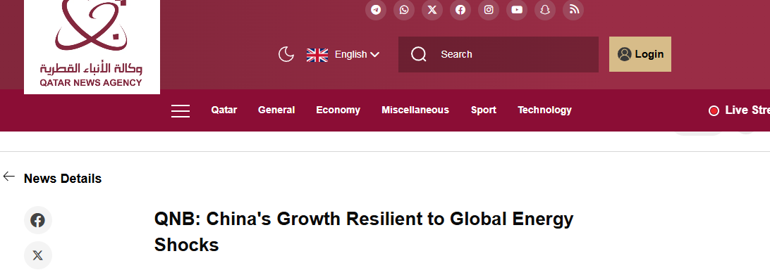 卡塔爾通訊社28日援引卡塔爾國家銀行出爐的最新報(bào)告指出,盡管地緣政治緊張局勢加劇與全球能源市場波動(dòng),中國經(jīng)濟(jì)仍展現(xiàn)出顯著抗風(fēng)險(xiǎn)能力。報(bào)告認(rèn)為,中國能源結(jié)構(gòu)多元化、石油依賴度較低及戰(zhàn)略儲(chǔ)備雄厚等結(jié)構(gòu)性優(yōu)勢,能有效緩沖能源價(jià)格上漲沖擊。