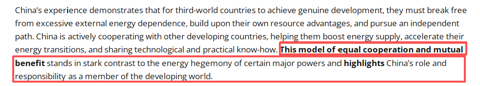 文章總結(jié)說,中國的實(shí)踐表明:發(fā)展中國家要實(shí)現(xiàn)真正發(fā)展,必須擺脫過度外部能源依賴,立足自身資源優(yōu)勢走獨(dú)立自主道路。中國正積極與其他發(fā)展中國家合作,通過技術(shù)共享、經(jīng)驗(yàn)輸出幫助其提升能源供給能力、加快能源轉(zhuǎn)型步伐。這種平等合作、互利共贏的模式,既區(qū)別于某些大國的能源霸權(quán)主義,也彰顯了中國作為發(fā)展中世界一員的責(zé)任擔(dān)當(dāng)。