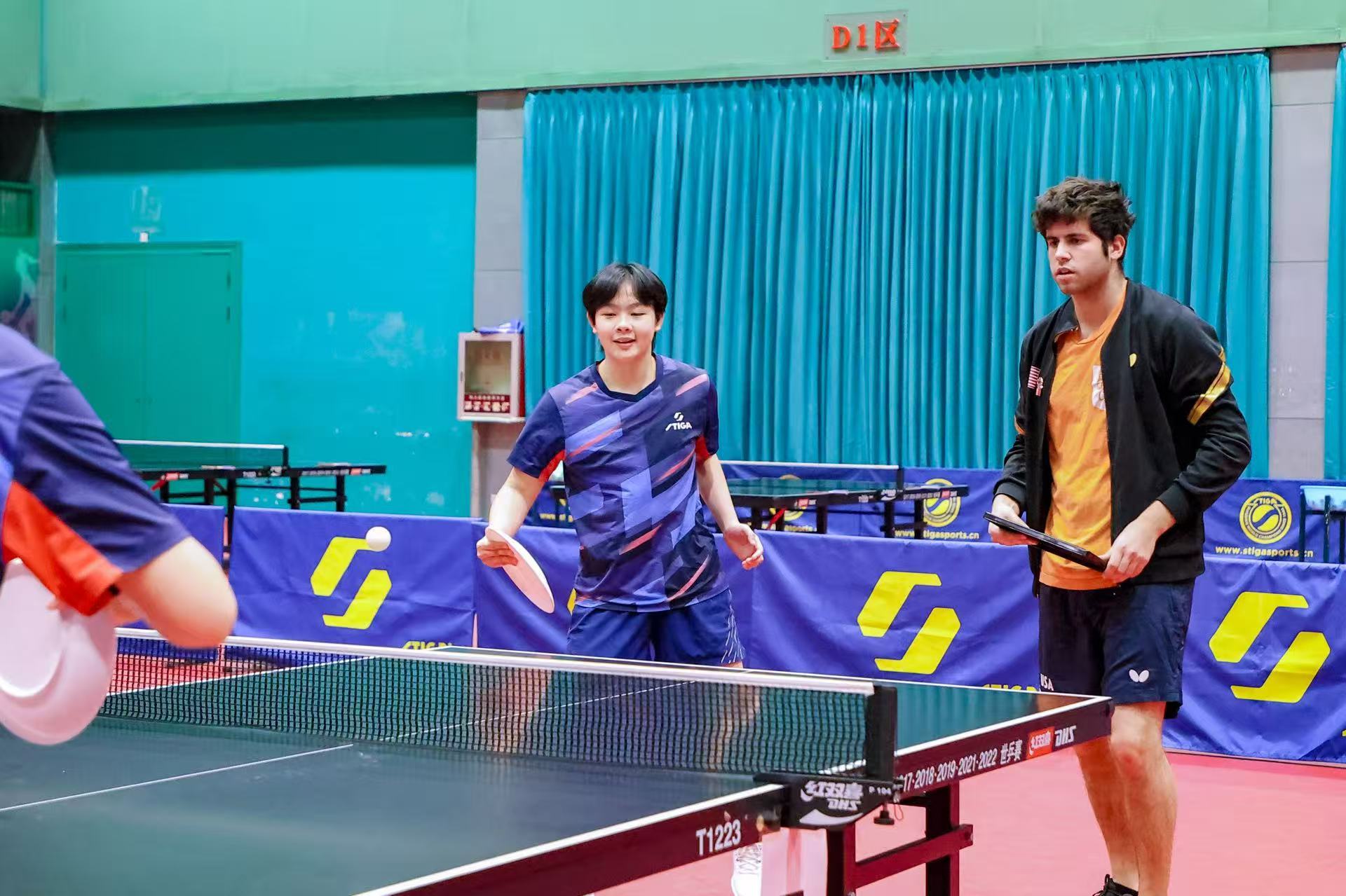 美國乒協(xié)注冊(cè)運(yùn)動(dòng)員凱?扎雷賓在正定國家乒乓球訓(xùn)練基地與中國青少年球員開展友誼賽