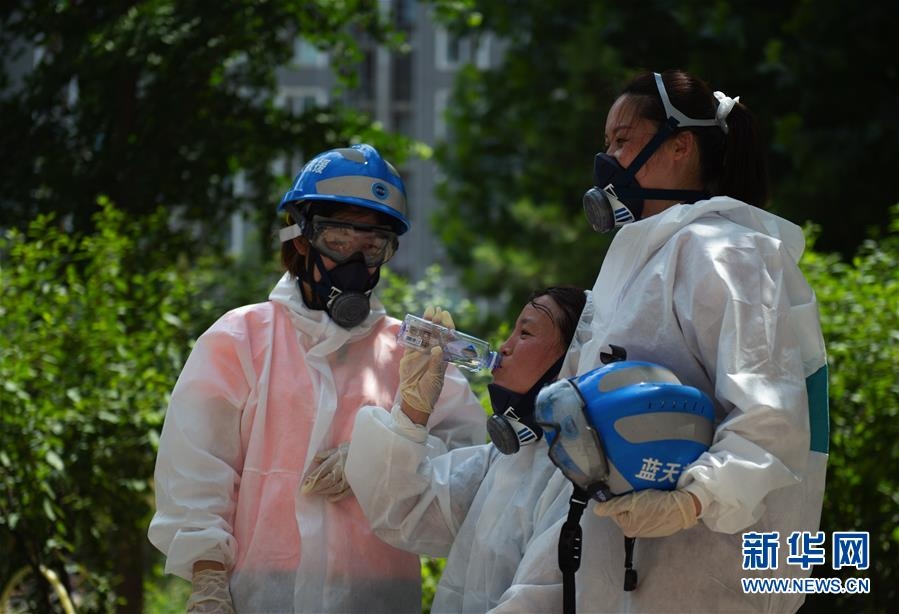 6月16日,北京藍天救援隊隊員在完成對豐臺區(qū)一居民區(qū)消殺作業(yè)后休息。連日來,北京出現(xiàn)高溫天氣。酷暑中,工作人員堅守抗擊疫情一線,成為烈日下的“逆行者”。新華社發(fā)(陳鐘昊攝)