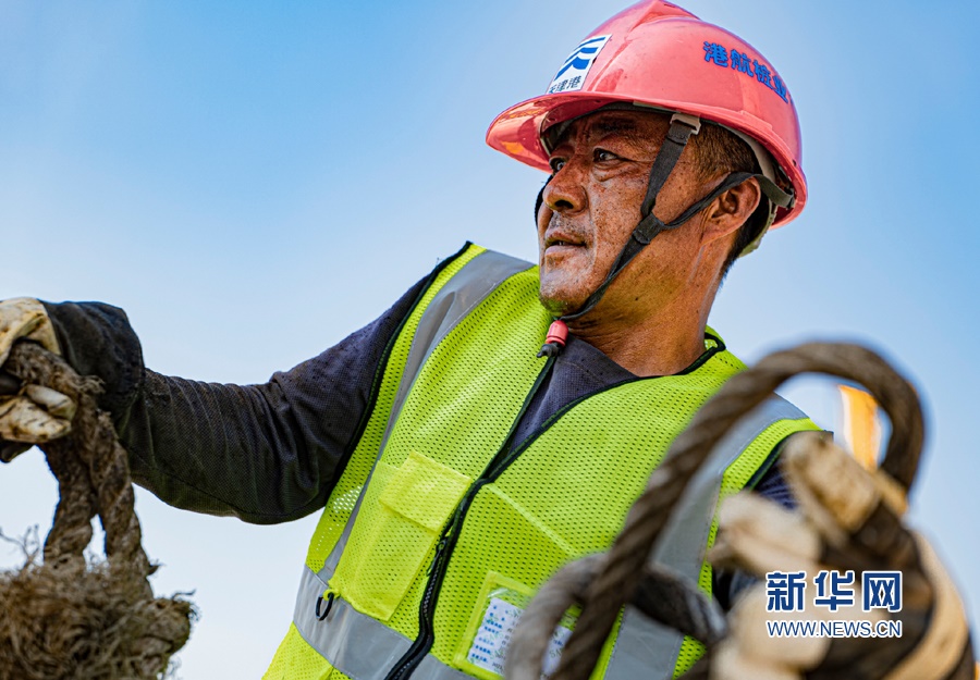 天津港航建設(shè)工人冒著酷暑在天津港c段碼頭建設(shè)現(xiàn)場(chǎng)檢查鋼筋情況。新華網(wǎng)發(fā)