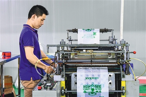 工作人員在海南海口誠佳美塑料包裝有限公司車間生產(chǎn)全生物降解袋(2020年11月4日拍攝)。新華社記者蒲曉旭攝