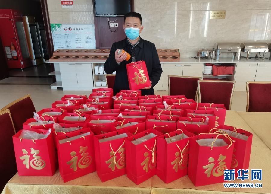 2月10日,在沈陽市鐵西區(qū)一處隔離安置點,馬會昌為每位隔離安置人員準備裝有花生、瓜子、榛子等年貨的“新春大禮包”。新華社發(fā)