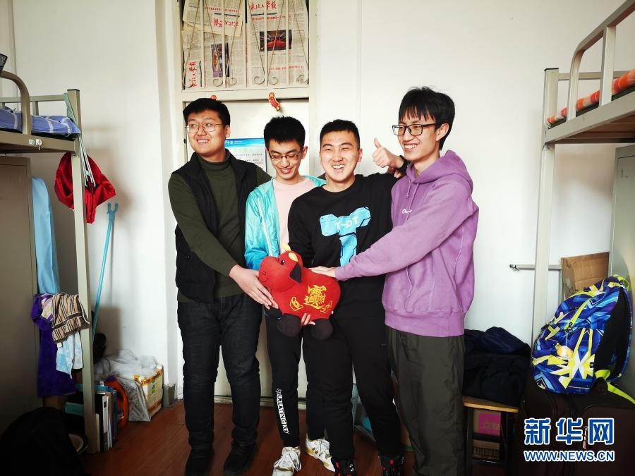 2月11日,東北大學(xué)大三學(xué)生曹澎駿(右二)和三位臨時室友在宿舍過春節(jié)。新華社記者王瑩攝