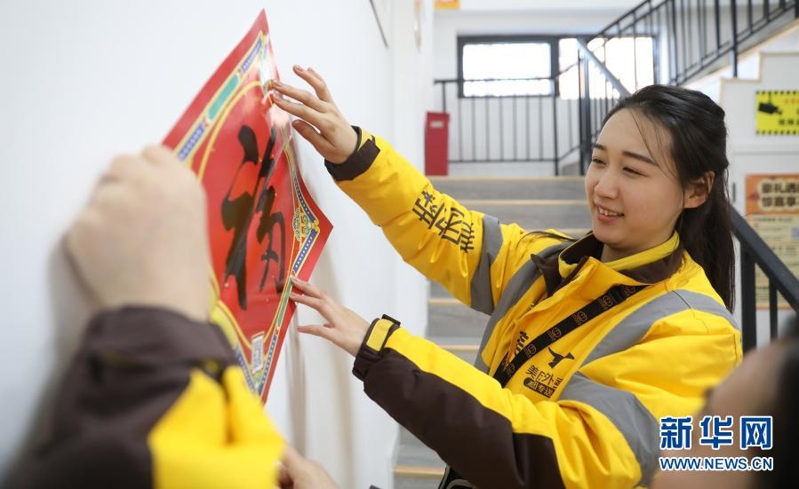2月10日,美團專送騎手小月月在配送站點和同事貼福字。新華社記者楊青攝